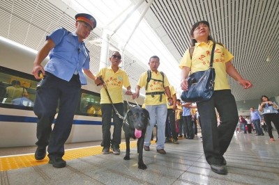 G6911次列車抵達(dá)洛陽龍門站,在工作人員的指引下,導(dǎo)盲犬引導(dǎo)主人出站。圖片攝影:王亞鴿