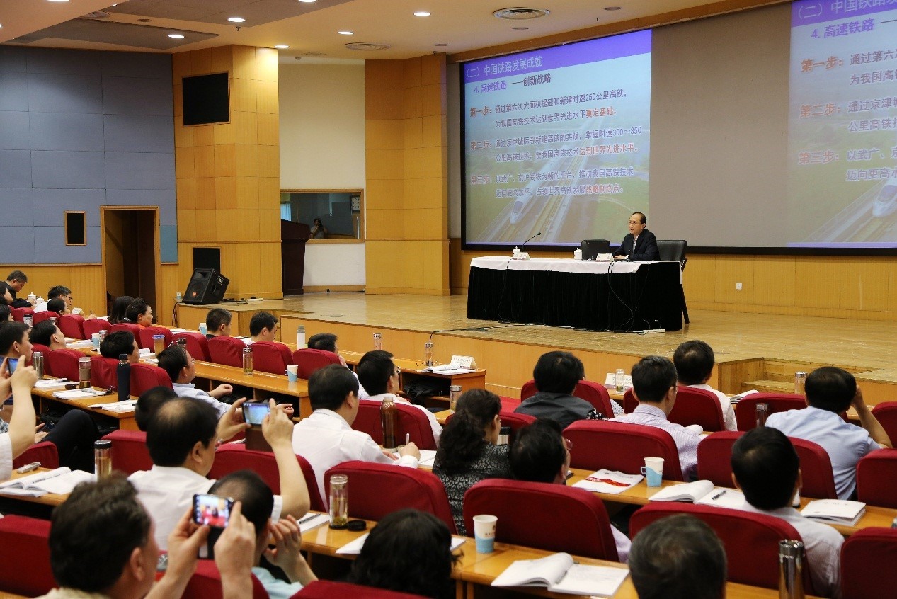5月14日,國家鐵路局黨組成員鄭健受國家行政學院邀請,為在校8個班次近400名學員作題為《中國鐵路“走出去”——鐵路服務“一帶一路”倡議的思考》的報告,從鐵路發展促進人類社會文明進步,中國鐵路改革發展歷程,到加快實施鐵路“走出去”,更好支撐“一帶一路”倡議,就學員們關心的問題進行了系統介紹和深入淺出分析。