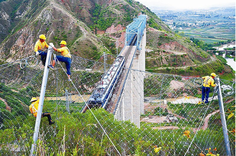 開遠工務段職工在檢查玉蒙線曲橋大橋被動防護網。入汛以來,該段以行車安全為重點,做到問題早發現、隱患早消除。圖片攝影:張文海