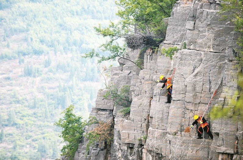 汛期,石頭受雨水沖刷極易松動,掉到線路上影響行車安全。月山工務段職工正在太行山脈的懸崖峭壁上清理危石。 圖片攝影:王占軍