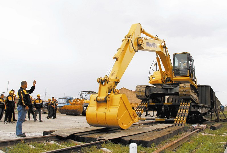 呼和浩特工務段職工在進行防洪挖掘機卸載演練。圖片攝影:常樂