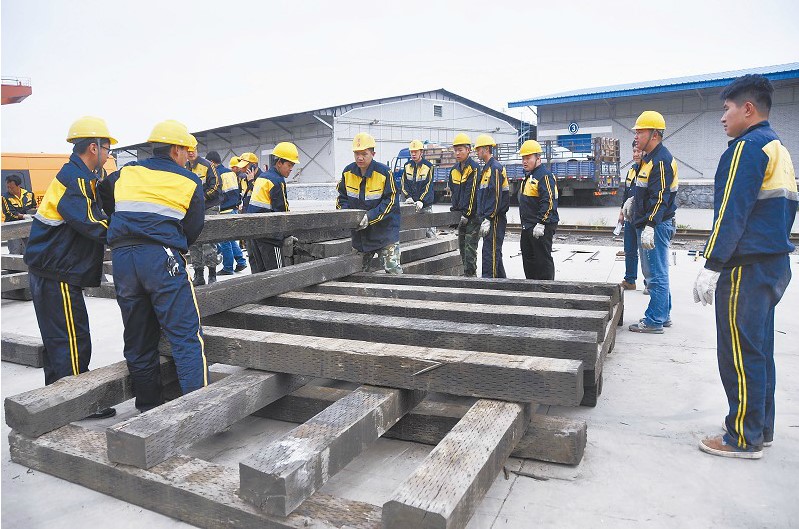 包頭工務段組織150名職工開展防洪實戰演練,職工在實戰演練中利用枕木搭建簡易橋墩。