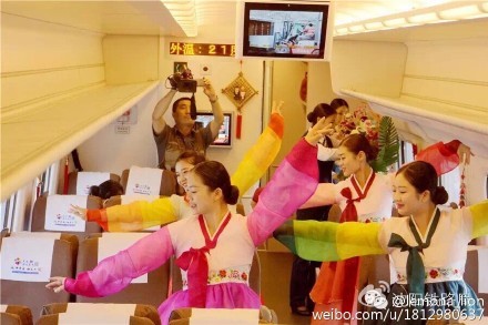 圖為C1012次列車上,吉林客運(yùn)段的動姐身著朝鮮族服裝為旅客跳起了歡樂的舞蹈。