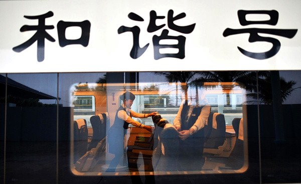 圖為海南環島高鐵的乘務員在做開車前的準備工作。