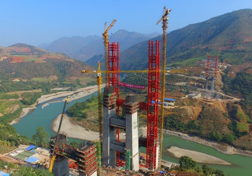 1月24日,中緬國際鐵路大理至瑞麗段的控制性工程——怒江特大橋全面開工。位于云南省施甸縣與龍陵縣交界處的怒江特大橋全長1024.2米,江面到橋面的高度為211米,大橋主跨采用跨度達490米的鋼桁拱梁,是目前世界上跨度最大的鋼桁梁鐵路拱橋。圖為怒江特大橋墩柱和纜索吊塔架。