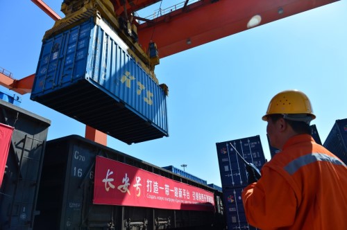 圖為中亞班列“長安號”首趟回程班列到達西安新筑貨場后,工作人員進行卸車作業。