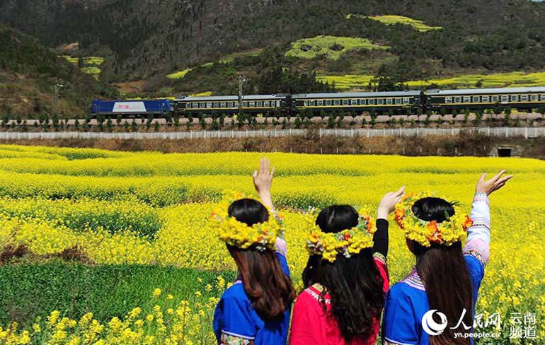 昆明鐵路局首次開行昆明至羅平賞花專列,滿足旅客踏春賞花需求。(圖片來源:人民網)