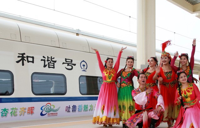 烏魯木齊鐵路局開行朝發夕歸高鐵杏花專列,開啟新疆“第一春”賞花之旅。(圖片來源:光明網)
