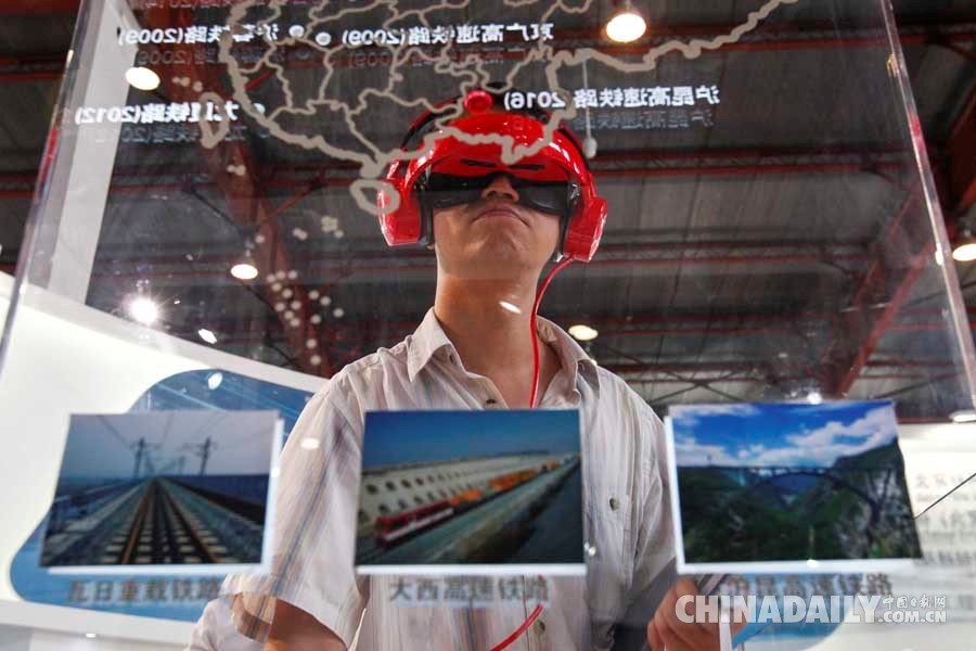 圖為觀眾佩戴VR眼鏡體驗滬昆高鐵、京廣高鐵的駕乘感受。