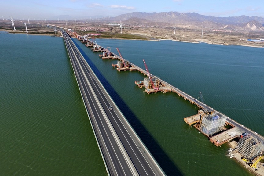 11月9日,新建京(北京)張(張家口)鐵路官廳水庫特大橋正在加緊施工。該特大橋是新建京(北京)張(張家口)鐵路重要節點工程,全長9077米,主橋采用8跨110米的變截面鋼桁梁跨越官廳水庫。目前,大橋主橋129根樁基和9個主橋主墩承臺已全部完成。圖為建設中的京(北京)張(張家口)鐵路官廳水庫特大橋與京張高速公路跨官廳水庫特大橋。
