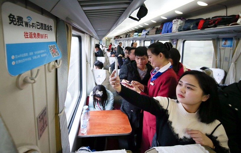 北京西至井岡山的Z133次旅客列車上,旅客用手機掃描免費WiFi二維碼。張學東 攝