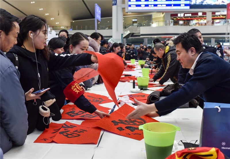 中國文聯、中國美協的書畫家在烏魯木齊站候車大廳,為廣大旅客寫“福”送“福”。趙戈 攝
