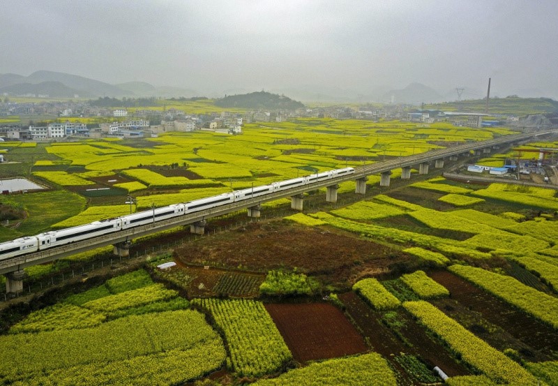 近日,貴州安順油菜花開,高鐵列車穿行其間,構成一幅幅美麗圖畫。圖為3月16日,一列動車組列車在滬昆高鐵貴州安順段行駛。