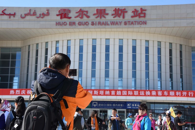 來自江蘇省的旅客聶傳貴(前)在霍爾果斯站前用手機為朋友拍照留影。