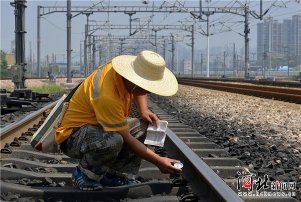 每當氣溫達到35℃以上,北京鐵路局石家莊工務段的巡熱工就要徒步巡查在高溫狀態下鐵軌是否出現脹軌跑道等不安全隱患。圖為巡熱工在查看軌溫表。(圖片來源:河北新聞網)