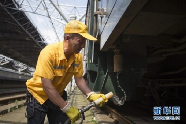上海南站,一名鐵路工人在烈日下為列車加注清水。(圖片來源:新華網)