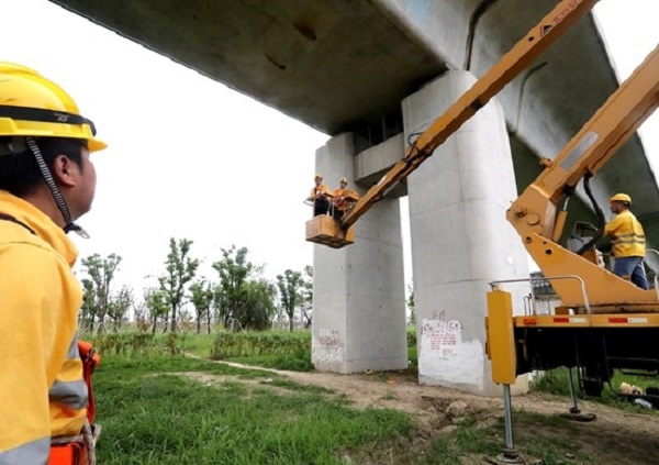 高溫天氣,鐵路橋梁有時會“患上”混凝土掉塊、鋼筋外露等影響設備使用壽命的“疾病”,這也是橋梁工們最為辛苦的時候。圖為上海工務段橋梁工正在對丹昆特大橋進行區段檢修維護。(圖片來源:人民網)