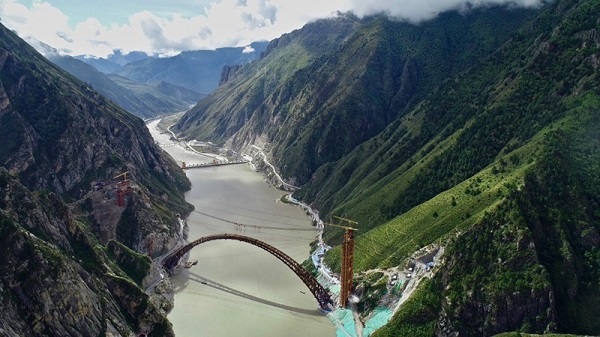 9月28日,隨著最后一節鋼管拱的對位和鎖定完畢,川藏鐵路拉林段藏木特大橋成功合龍,標志著大橋主體結構施工取得了關鍵性勝利。藏木特大橋由中國中鐵廣州局集團承建,拱高112米,橋橫跨雅魯藏布江峽谷,水深66米。