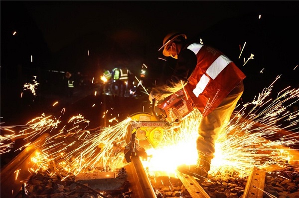 11月7日是立冬節氣,貴州鐵路部門針對氣溫降低的情況,對鐵道線路、信號設備等進行全面“體檢”,確保冬季列車運行安全。圖為貴陽工務段職工在渝貴鐵路線更換重傷鋼軌。