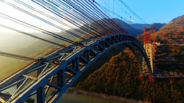 12月10日,云南大理至瑞麗鐵路全線重點控制性工程——怒江四線特大橋鋼桁拱順利合龍,標志著我國“一帶一路”中緬國際鐵路通道建設取得重大進展。大橋主跨為單跨達490米的鋼桁拱,一跨飛越怒江天塹,是目前世界上鐵路拱橋的最大跨度。