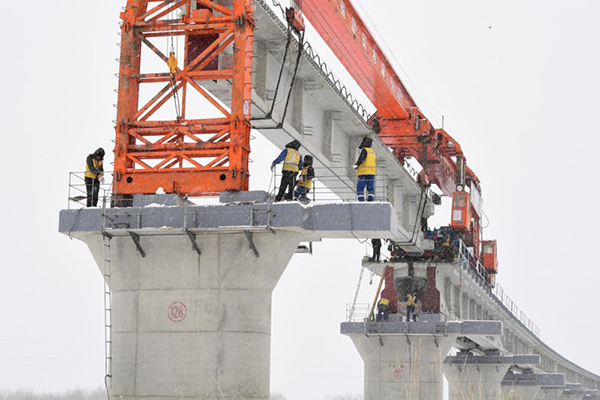12月18日,在川藏鐵路拉林段工地,建設(shè)者頂風(fēng)冒雪在貢嘎雅魯藏布江特大橋上進(jìn)行鋪軌架梁作業(yè)。川藏鐵路拉薩到林芝段是西藏第一條電氣化鐵路,正線全長(zhǎng)435.48公里,設(shè)計(jì)時(shí)速160公里,預(yù)計(jì)2021年建成通車(chē)。