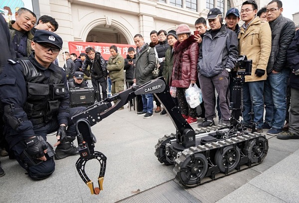 武漢鐵路公安處在漢口火車站舉行警營開放日活動,讓旅客們觀看警用排爆機器人演示。