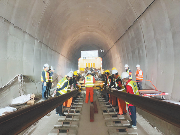 4月6日,由中鐵五局承建的衢寧鐵路(福建段)首組500米長軌精準安設在衢寧鐵路(福建段)檔元隧道無砟道床軌槽內,標志著衢寧鐵路(福建段)軌道工程首組長軌成功鋪設。