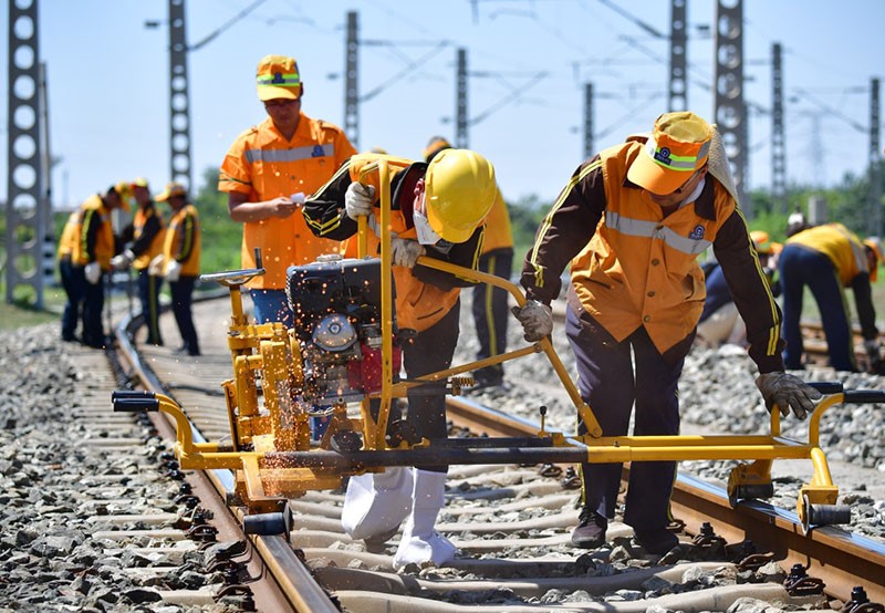 連日來西安持續高溫天氣,在陜西中歐班列的始發地——西安新筑車站,鐵路工人頂著烈日堅守崗位,確保列車、鋼軌運行狀態良好。