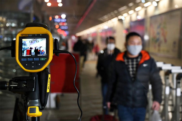 圖為天津西站客運人員在出站口為每位下車出站旅客進行體溫監(jiān)測。