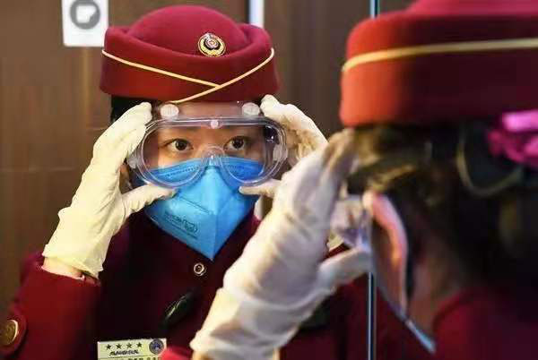 圖為京津城際列車乘務員在開車前對自己安全防護進行檢查。