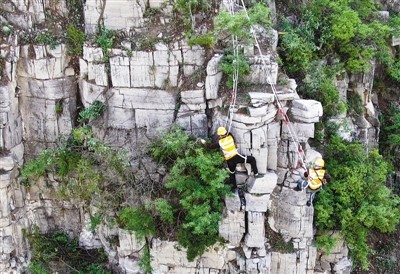 在太行山深處的中國鐵路鄭州局集團有限公司月山工務段,有一群被稱為捅山工的人。每年汛期來臨前,他們都要對山體進行檢查、清理,在懸崖峭壁間“行走”,揮動手中的鋼釬,排除威脅鐵路行車安全的危石。圖為日前,捅山工正在排除危石。