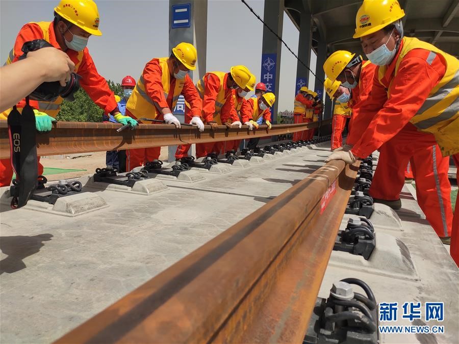 6月3日上午,在京雄城際鐵路(河北段)鋪軌施工現場,隨著中鐵十二局集團現場指揮人員一聲號令,一組500米長鋼軌平穩落在無砟道床上,標志著京雄城際鐵路(河北段)建設進入鋪軌階段。