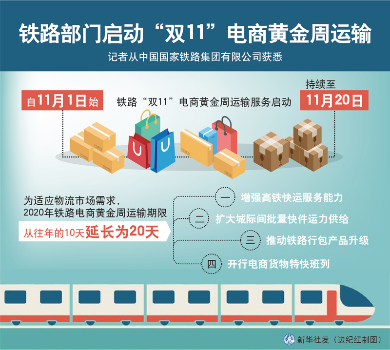 11月1日,鐵路“雙11”電商黃金周運輸服務啟動,持續至11月20日。鐵路部門充分發揮高鐵成網運行和安全快捷等優勢,優化運力供給,首次試點復興號動車組整列裝運快件,努力滿足人民群眾日益增長的物流服務需求。