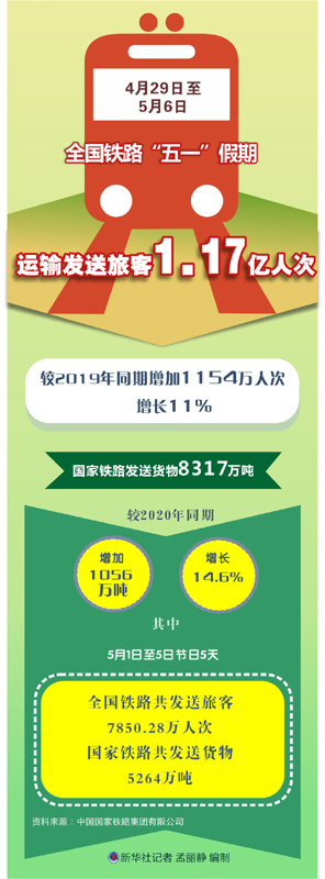 假期運(yùn)輸期間,鐵路客貨運(yùn)量持續(xù)高位運(yùn)行,全國鐵路共發(fā)送旅客1.17億人次,較2019年同期增加1154萬人次、增長11%;國家鐵路發(fā)送貨物8317萬噸,較2020年同期增加1056萬噸、增長14.6%。其中,5月1日至5日節(jié)日5天,全國鐵路共發(fā)送旅客7850.28萬人次;國家鐵路共發(fā)送貨物5264萬噸。