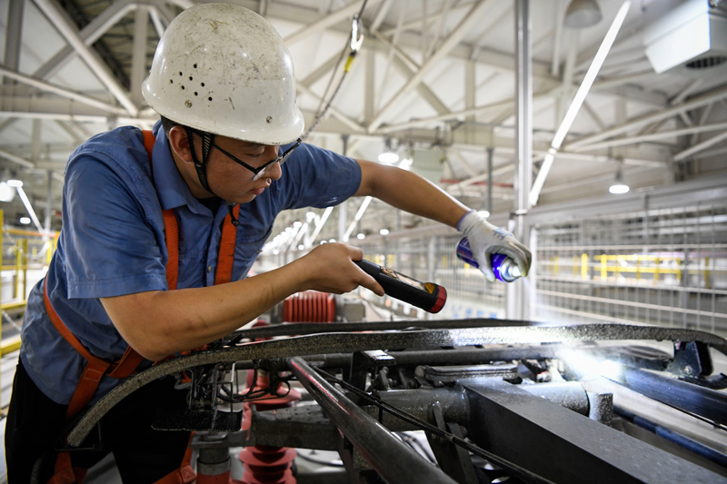 7月11日,銀川動車運(yùn)用所工作人員在檢查列車受電弓的氣密性。
