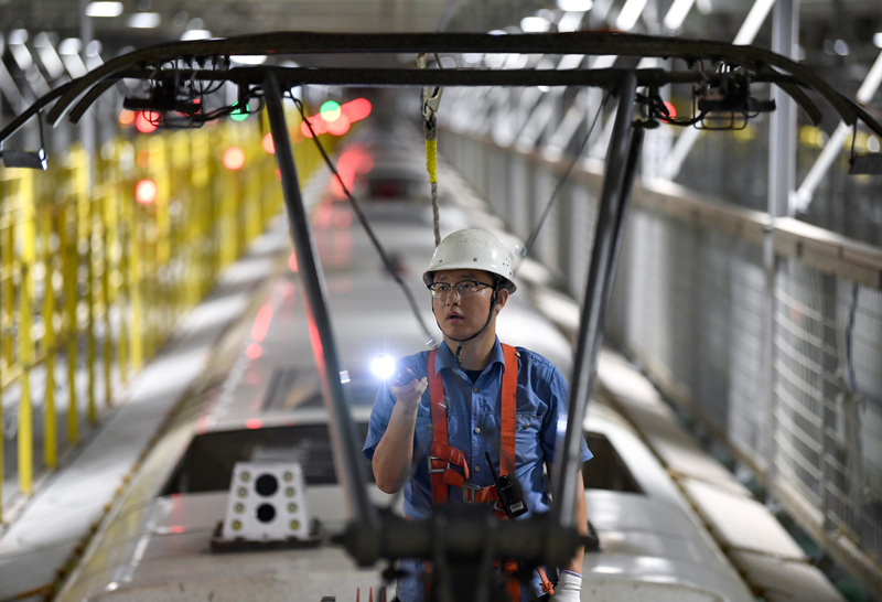 7月11日,銀川動車運(yùn)用所工作人員在檢查列車頂部蓋板。