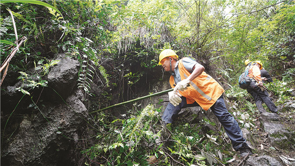 柳州工務段排查隊隊員在排查危巖落石。