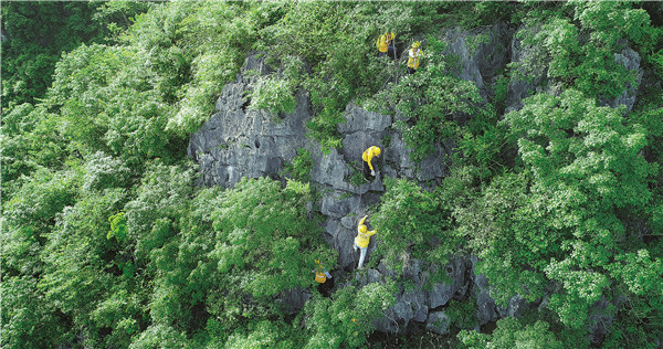 危石班職工在峭壁間攀爬,搜山掃石。
