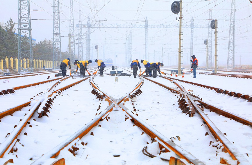 近日,受東北冷渦及地面氣旋強烈發(fā)展影響,遼寧、吉林、內(nèi)蒙多地出現(xiàn)雨雪寒潮天氣,內(nèi)蒙古東部地區(qū)積雪深度達到22厘米。中國鐵路沈陽局集團有限公司19萬干部職工積極投入到線路道岔除冰融雪,保障運輸秩序,確保旅客安全乘降等重點工作當中,堅決確保鐵路運輸安全平穩(wěn)有序。
