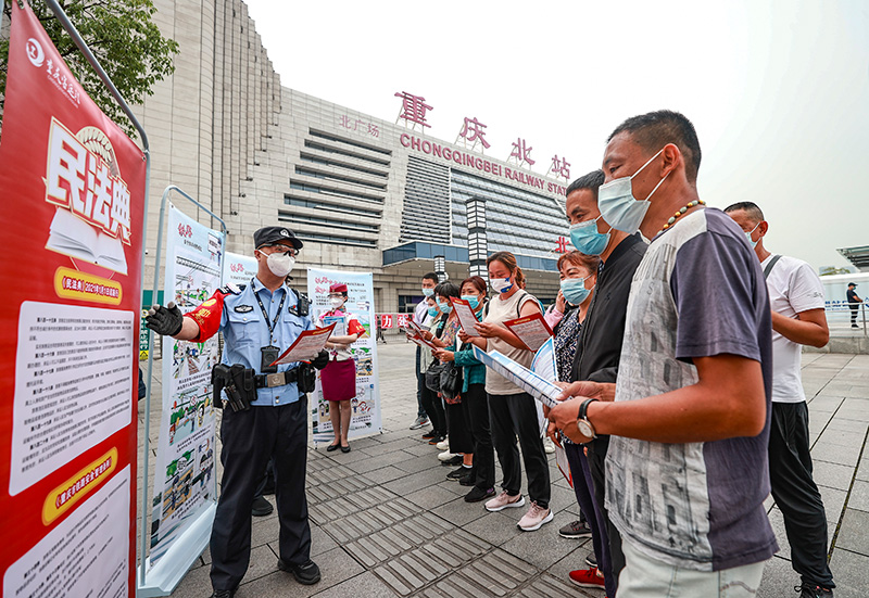 在重慶北站北廣場,來自重慶鐵路公安處的普法宣傳志愿者給旅客講解鐵路安全法律法規相關知識。
