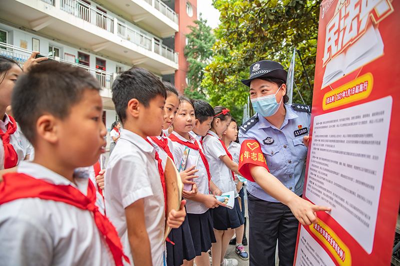 在重慶兩江新區人和小學,來自重慶鐵路公安處的普法宣傳志愿者在給學生們講解鐵路相關的法律法規。