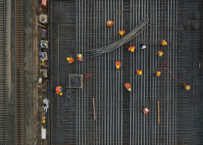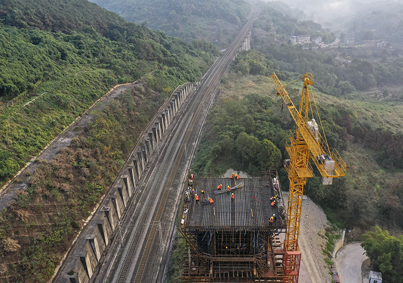 工人在渝昆高鐵川渝段華福特大橋施工現場作業。