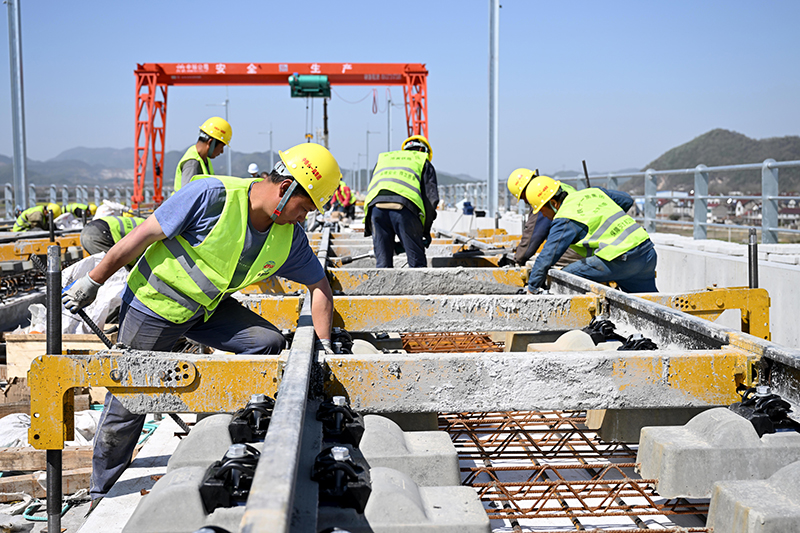 中鐵十一局池黃鐵路建設現場,工人進行無砟軌道施工作業。