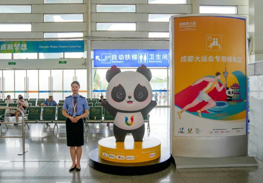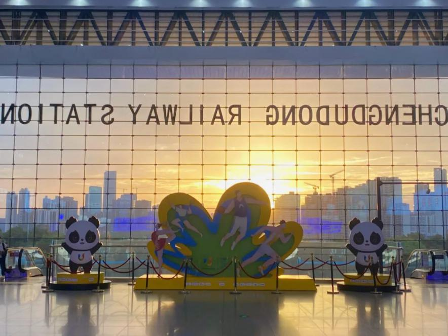 作為成都大運會官方抵離服務點的成都東站,以“感受中國速度、共赴青春之約”為主題,利用大運會主視覺體系為基底、吉祥物“蓉寶”等元素為重點打造大運會主題車站。在北進站口東側開辟大運會專用通道,方便抵離客群快速進入車站;打造大運會專用候車區,候車區內設置有抵離服務臺,提供茶點、充電寶、飲用水等,為抵離客群提供更加優質的服務保障;設置大運會吉祥物造型、大運會打卡點等。環蓉地區的成都東、成都西、成都南、雙流機場、新都東等多個車站還進行了環境衛生改善及鐵路沿線環境整治,努力創造美好溫馨的乘車環境。