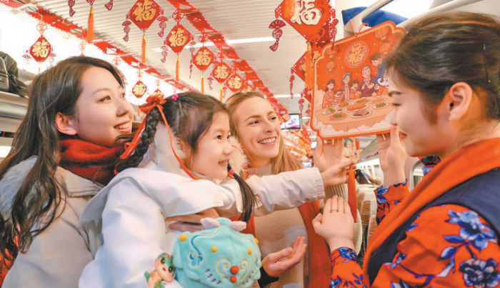 在北京西站開往鄭州東站的G97次列車上,中國鐵路鄭州局集團公司工作人員組織各式“迎新春”特色活動,讓乘客在旅途中感受春節的美好氛圍。