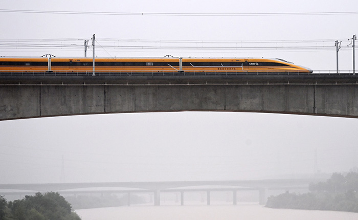 聯調聯試綜合檢測列車駛過位于陜西省西安市的西延高鐵渭河特大橋。