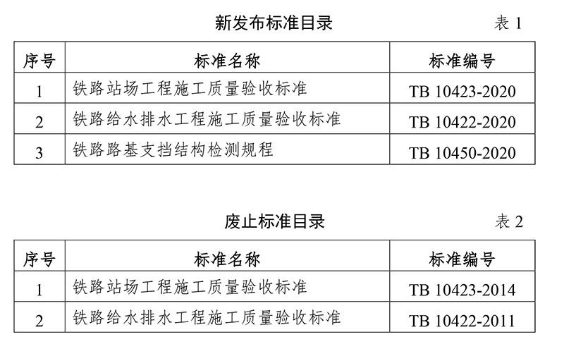 現公布《鐵路站場工程施工質量驗收標準》(TB 10423-2020)等3項鐵路工程建設標準(見表1),自2020年8月1日起實施。以上標準由中國鐵道出版社有限公司出版發行?!惰F路站場工程施工質量驗收標準》(TB 10423-2014)等2項鐵路工程建設標準(見表2)同時廢止。