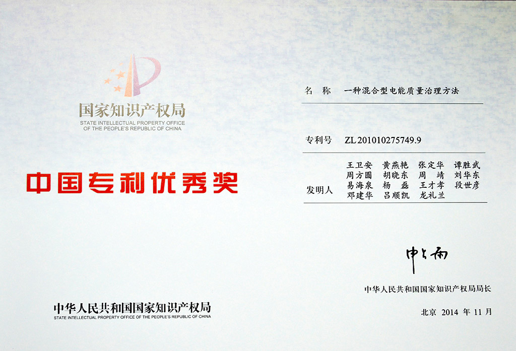 “一種混合型電能質量治理方法”專利技術實現了低成本大容量的無功、諧波和負序的快速綜合治理,極大提升了國內電能質量治理的國際競爭力,專利權人為株洲變流技術國家工程研究中心有限公司。