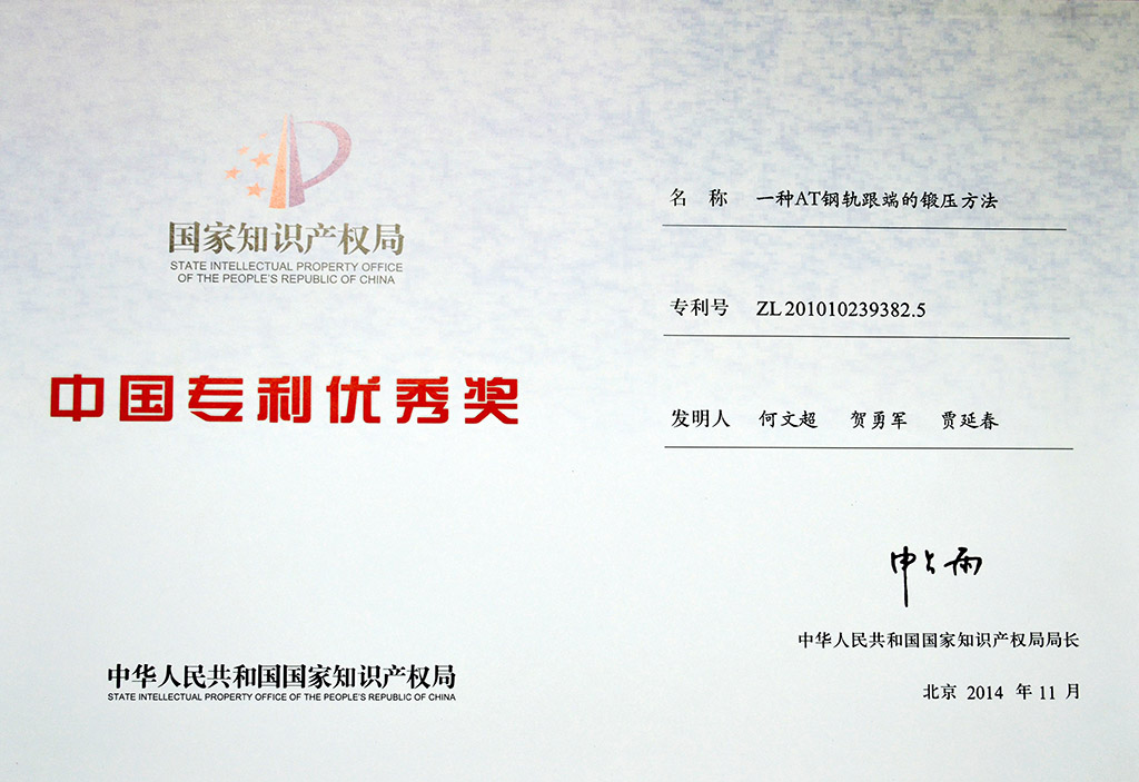 “一種AT鋼軌跟端的鍛壓方法”專利形成了具有自主知識產權的國產化鋼軌鍛壓成型成套技術,目前已廣泛應用于國內高速、提速和普速鐵路以及城市地鐵、輕軌道岔等各類道岔產品中,專利權人為中國鐵建重工集團有限公司道岔分公司。