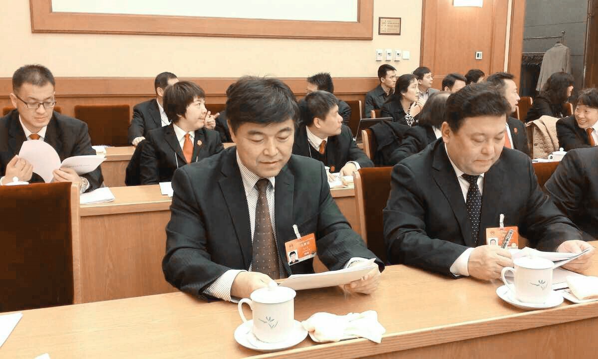 圖為全國人大代表、上海鐵路監管局局長唐士晟(前排左一)參加新疆代表團審議《政府工作報告》。